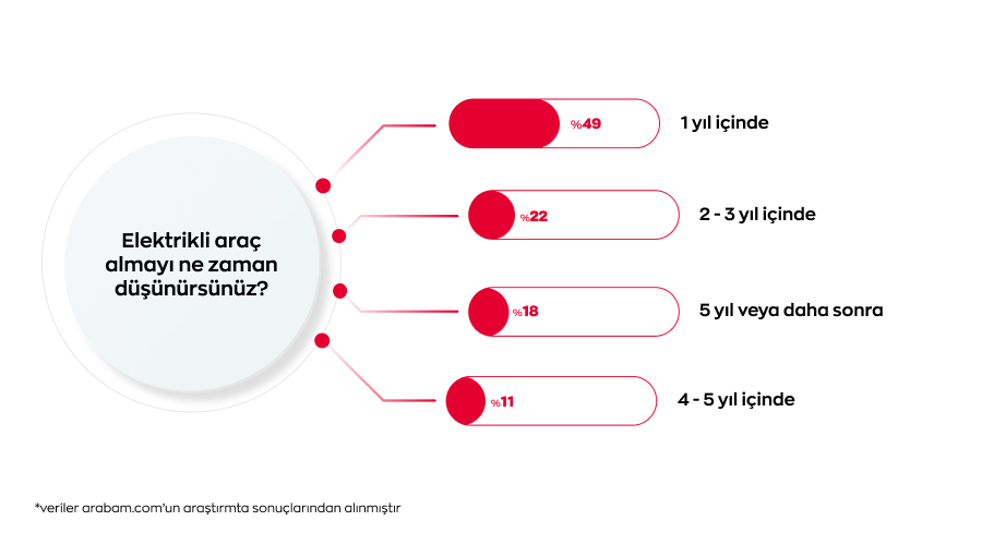 Elektrikli araç almayı planlayan katılımcılara ‘’Elektrikli araç almayı ne zaman düşünürsünüz?’’ sorusu yöneltildiğinde, %49’u 1 yıl içinde, %22’si 2-3 yıl içinde, %18’i 5 yıl veya daha sonra ve %11’i 4-5 yıl içinde almayı planladığını belirtti. Bu sonuçlar, kısa vadede elektrikli araçlara geçiş niyetinin giderek arttığını gösteriyor.