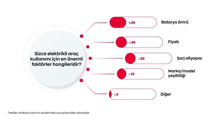 arabam.com’un araştırmasında “Elektrikli araç kullanımı için en önemli faktörler hangileridir?” sorusuna verilen yanıtlarda %36 ile batarya ömrü ilk sırada yer aldı. %26’sı fiyatı, %22’si şarj altyapısını, %13’ü marka ve model çeşitliliğini en önemli faktör olarak belirtti. Katılımcıların yalnızca %3’ü diğer unsurları öne çıkardı.