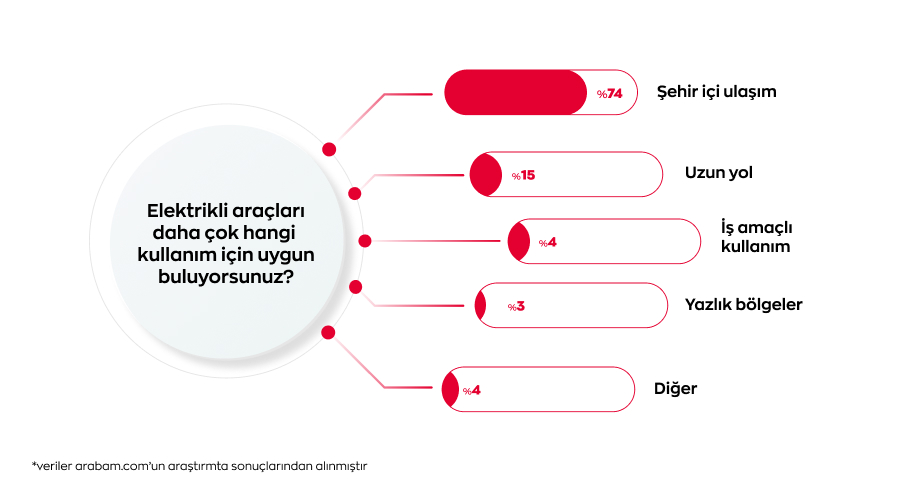 Katılımcılara “Elektrikli araçları daha çok hangi kullanım için uygun buluyorsunuz?” sorusu yöneltildiğinde %74’ü elektrikli araçların kullanım alanı olarak şehir içi ulaşımı işaret etti. %15’i uzun yol, %4’ü iş amaçlı kullanım, %3’ü ise yazlık bölgeler için uygun olduğunu belirtti, %4’lük bir kesim ise diğer seçeneğini işaretledi.