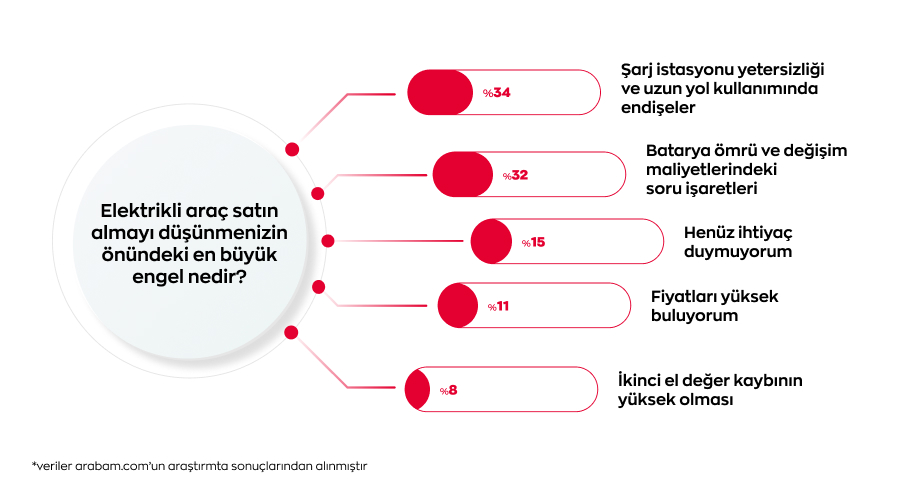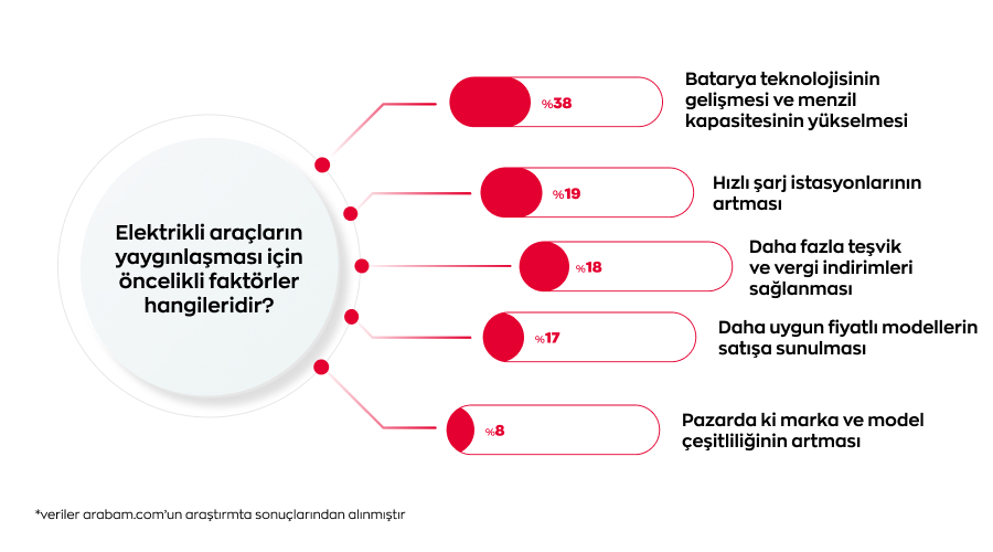 arabam.com’un araştırmasına göre ‘’Elektrikli araçların yaygınlaşması için öncelikli faktörler hangileridir?’’ sorusuna katılımcıların %38’i batarya teknolojisinin gelişmesi ve menzil kapasitesinin yükselmesini, %19’u hızlı şarj istasyonlarının artmasını, %18’i daha fazla teşvik ve vergi indirimleri sağlanmasını, %17’si daha uygun fiyatlı modellerin satışa sunulmasını, %8’i ise pazardaki marka ve model çeşitliliğinin artmasını öncelikli etkenler olarak değerlendirdi.