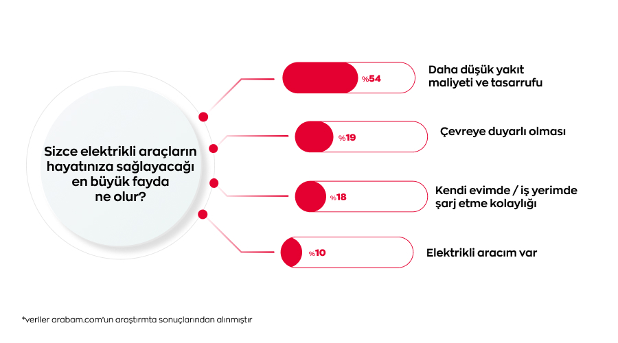 ‘’Elektrikli araçların hayatınıza sağlayacağı en büyük fayda ne olur?’’ sorusu yöneltildiğinde katılımcıların %54’ü daha düşük yakıt maliyeti ve tasarrufu, %19’u çevreye duyarlı olmasını, %18’i ev veya iş yerinde şarj etme kolaylığını, %10’u ise konforlu ve teknolojik sürüş deneyimini en önemli faydalar olarak gördü.