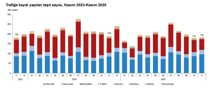 Kasım ayında 183 bin 172 adet taşıtın trafiğe kaydı yapıldı.